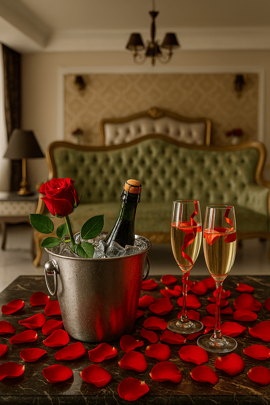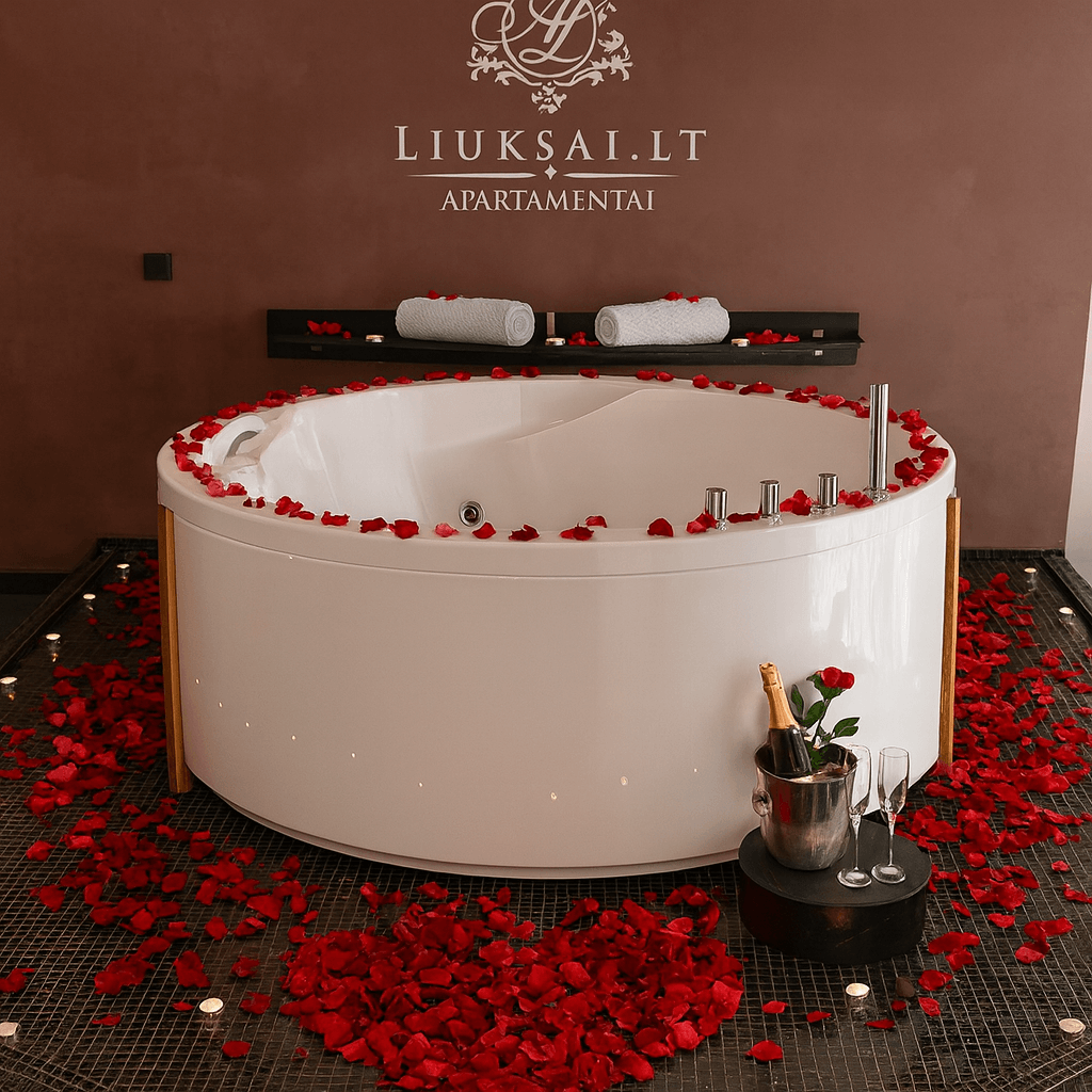 Šimtai rožių žiedlapių aplink jacuzzi sukuria vaizdą tarsi iš Balio rožių vonių ritualo. Ant staliuko – šaldytuve atvėsintas šampanas, taurės ir ledukai kibirėlyje su gėle, pasiruošę vakaro akimirkai. Žvakutės ir subtilios detalės užtikrins, kad erdvė taps romantiškiausia vieta tik Jums dviem. 🥂🕯️