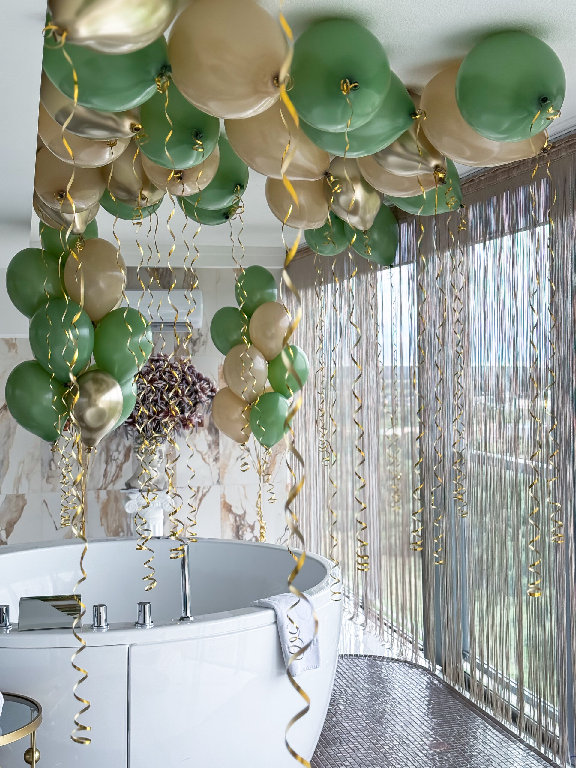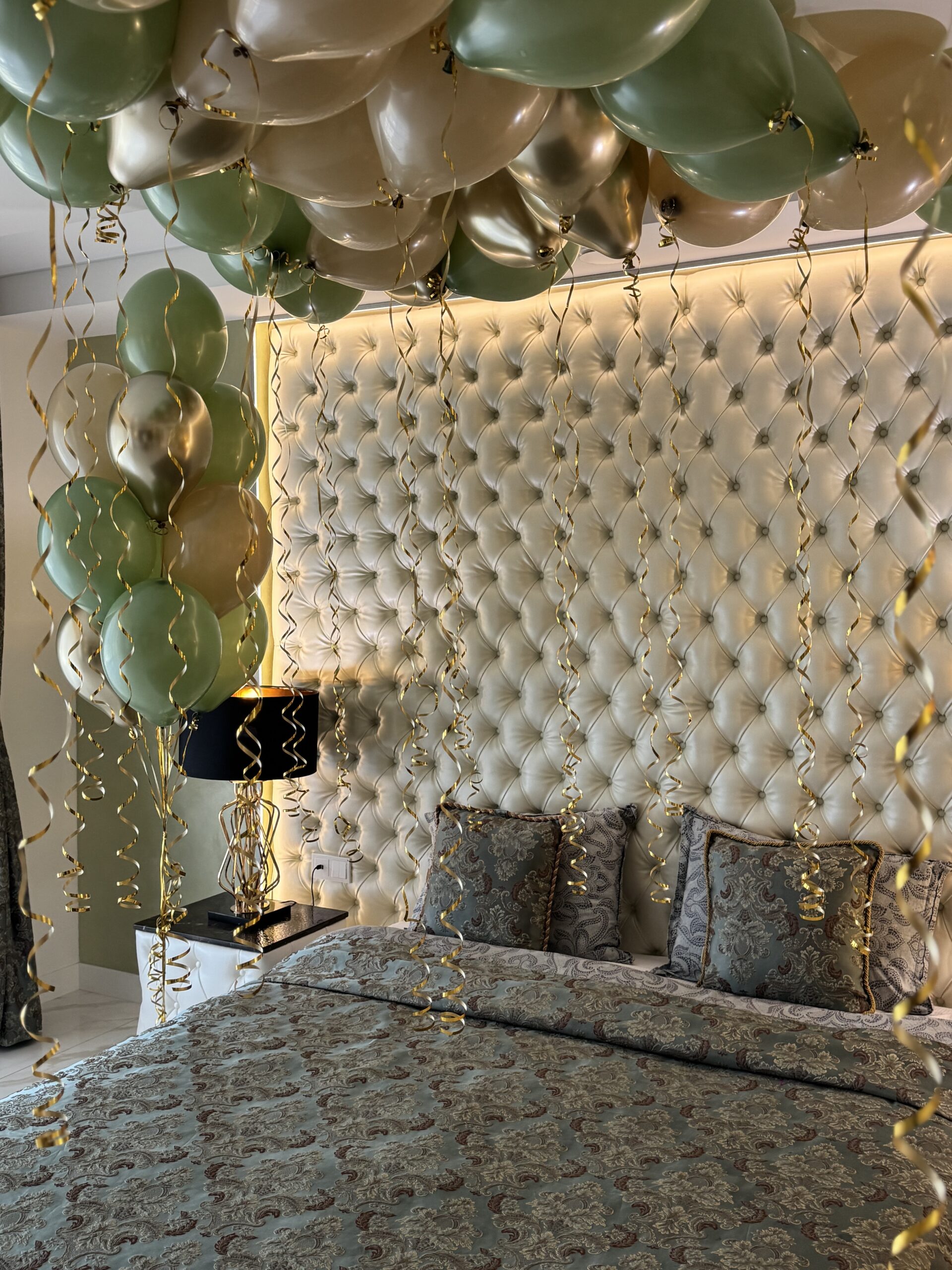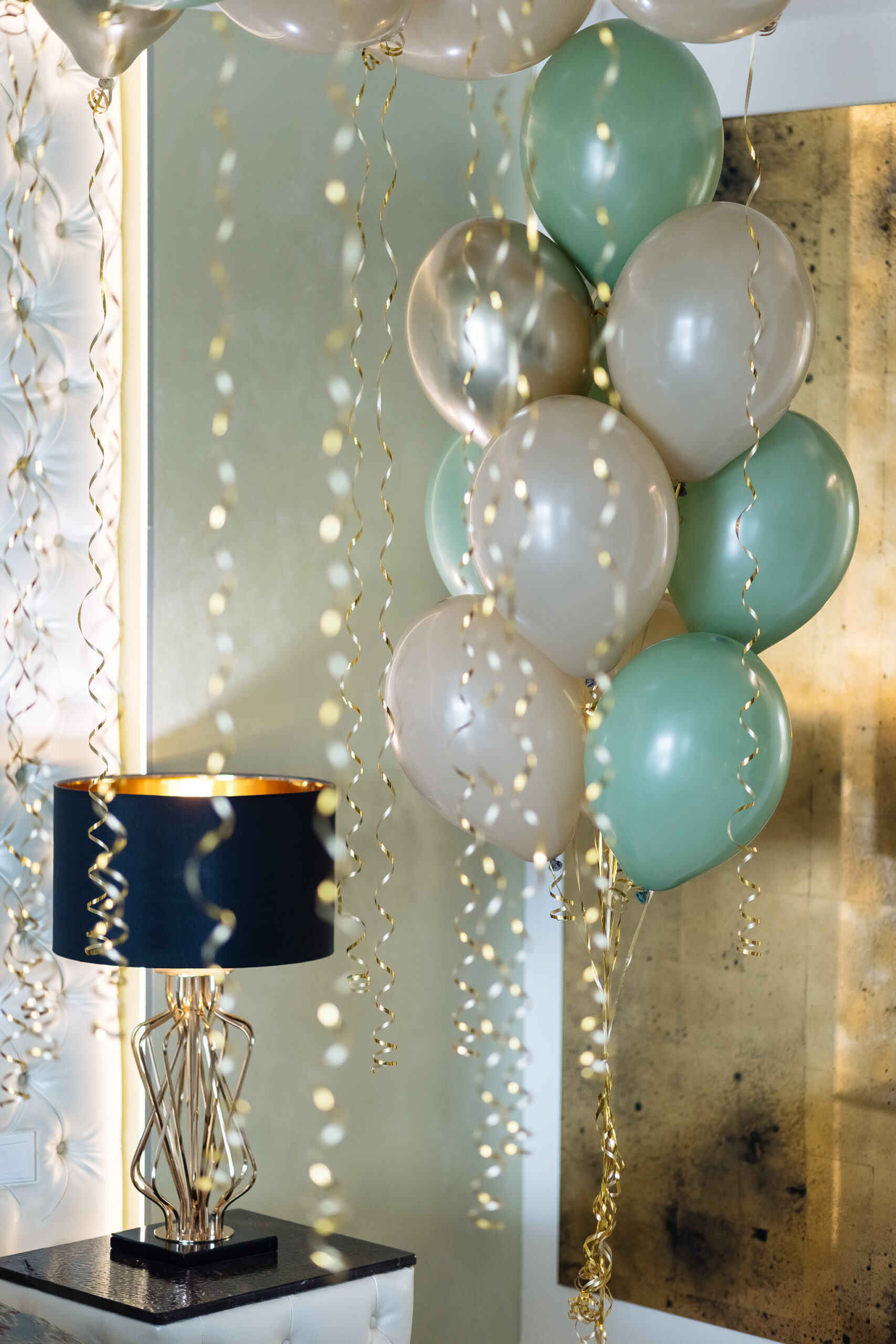 Įspūdinga staigmena, kurią pastebėsite iš karto įėję į apartamentą. Kelios dešimtys helio balionų sukuria šventišką, prabangią atmosferą ir visiškai pakeičia interjero nuotaiką.