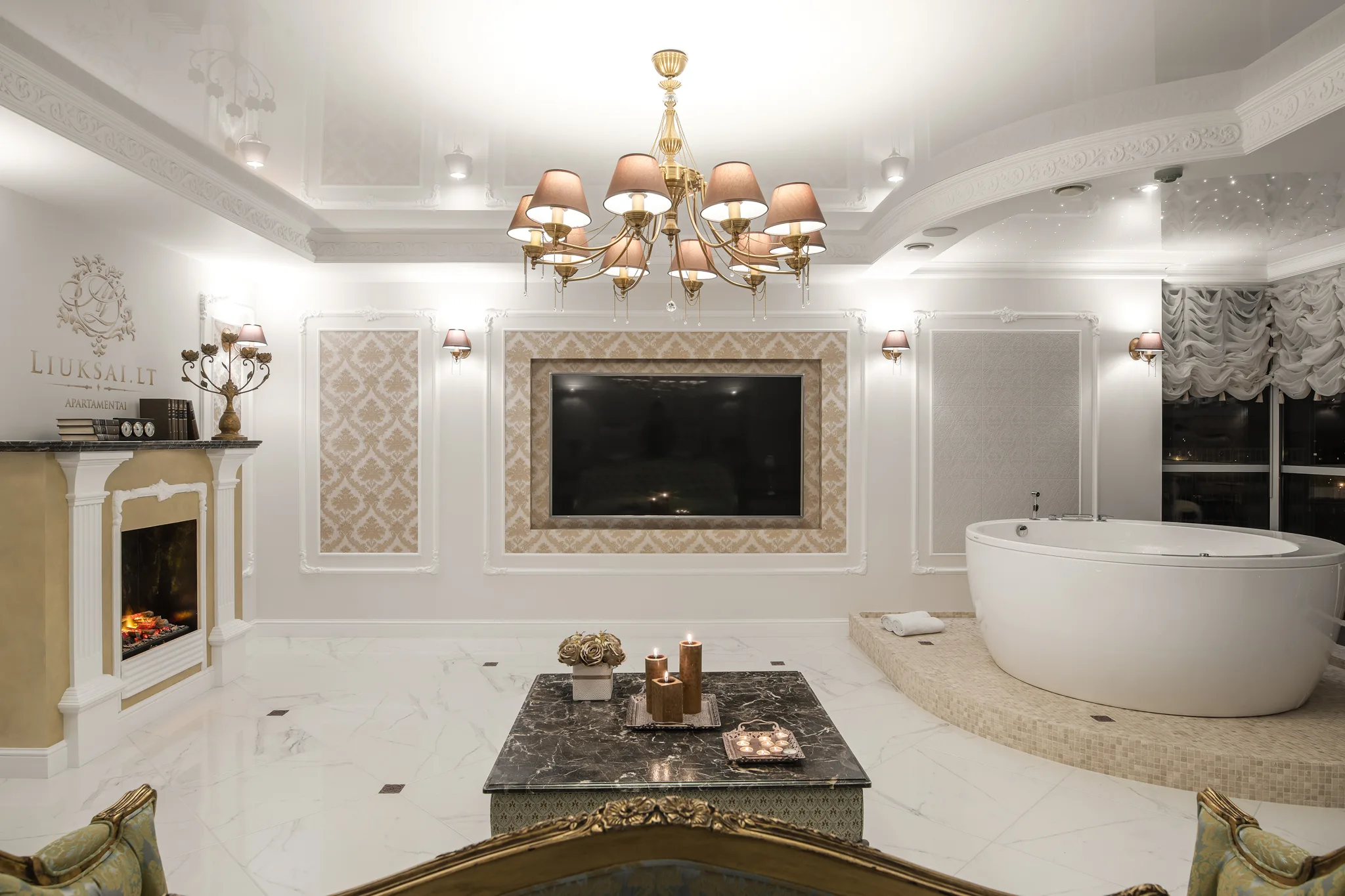 Apartamentų interjeras – modernus ir patogus, su ypatingu dėmesiu detalėms. Gulėdami lovoje matysite burbuliuojantį jacuzzi, o romantišką atmosferą dar labiau žadins fone grojanti muzika. Patirkite meilės magiją prabangiuose apartamentuose – užsisakykite savo svajonių nakvynę!