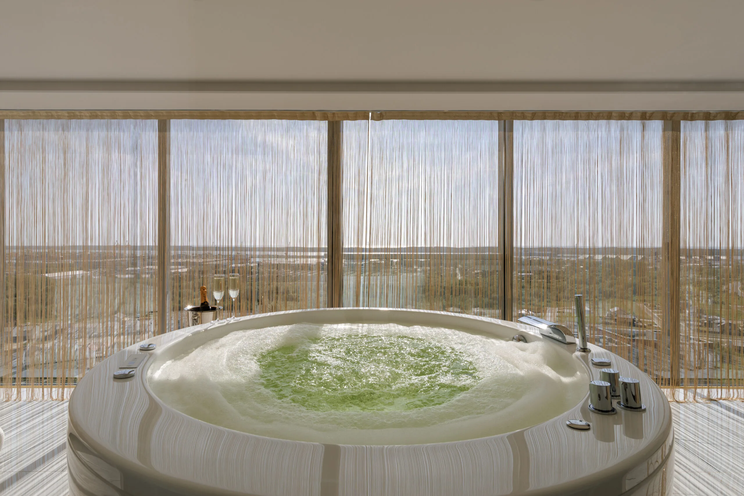 Mūsų išskirtinumas – iš jacuzzi vonios matomas panoraminis vaizdas pro langą į Kuršių marias, Neringos kopas, Baltijos jūrą. Už tokią galimybę viešbutyje suplosite nemenką sumą pinigų.